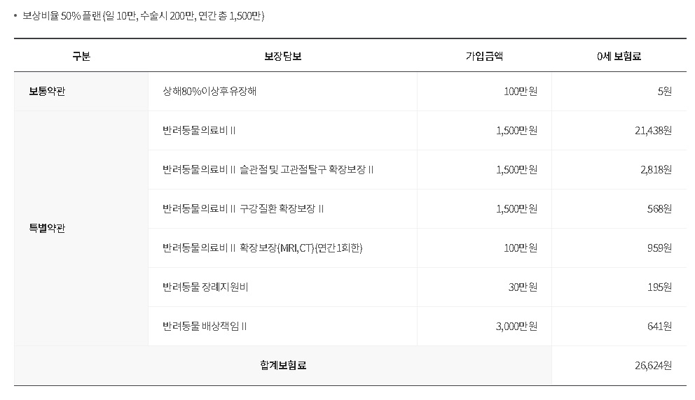| 보장 내용 | [보통약관] ·상해80%이상후유장해(최초1회) [선택 계약] [반려동물 의료비] ·반려동물 의료비Ⅱ ·구강질환 확장보장Ⅱ ·슬관절및고관절탈구 확장보장Ⅱ ·반려동물의료비Ⅱ 확장보장(MRI,CT) [반려동물 배상책임] ·반려동물 배상책임Ⅱ [반려동물 사망] ·반려동물 장례지원비 |