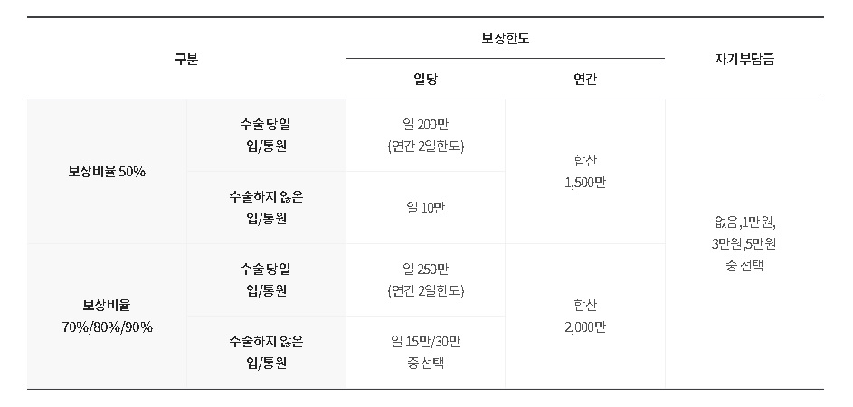| 입원/통원 | ·실속형 : 1일 10만 원 한도, 수술 시 1일 200만 원 한도 보장 ·고급형 : 1일 15만 원 한도, 수술 시 1일 250만 원 한도 보장 ·프리미엄 : 1일 30만 원 한도, 수술 시 1일 250만 원 한도 보장 |