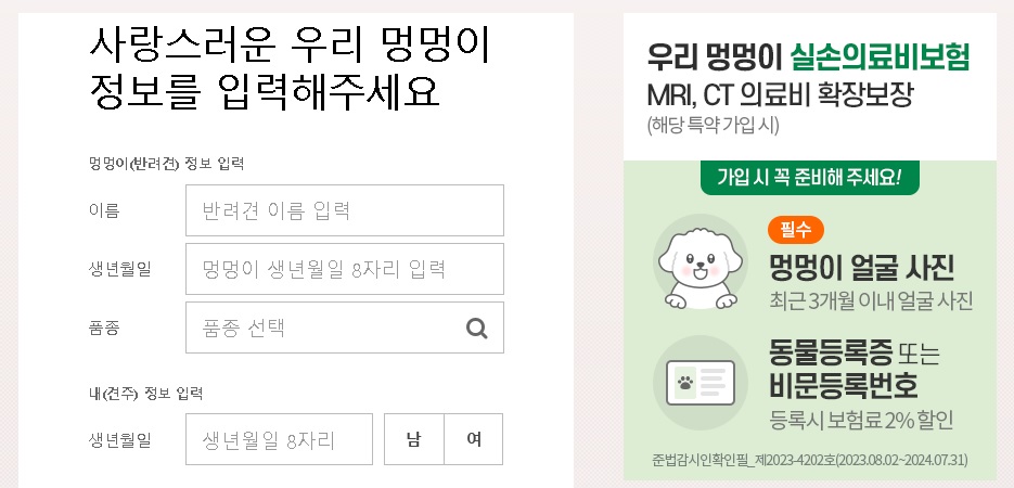 펫보험에 가입을 하기 위해서는 반려견의 이름, 생년월일, 품종, 성별 그리고 보호자의 정보를 입력해야 하며, 기존에 진단을 받았던 진병에 대해서 고지를 해야 한다.