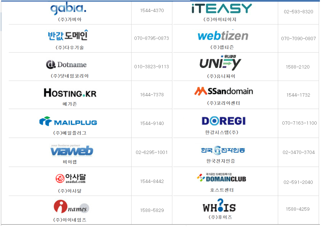 한국 인터넷 진흥원에서는 이용자들에게 합리적인 가격과 다양한 부가서비스 제공을 위해서 다수의 등록대행자들과 국가 도메인 등록 대행을 맺고 있으며, 2022년 10월 현재 가비아, 메가존, 아이네임즈, 후이즈를 포함해 16개 업체가 서비스를 제공하고 있다. 이들 업체가 제공하는 등록비용, 연장비용 등의 가격과 파킹, 포워팅 등의 부가서비스에는 차이가 있으므로 아래의 이미지를 참고해서 자신에게 가장 알맞은 업체를 선택하도록 해야 한다.