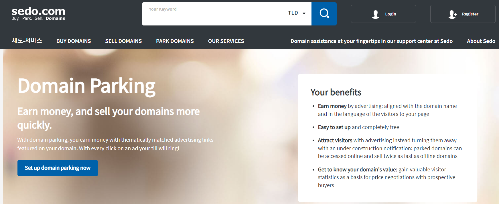 - 도메인 파킹 수익 : 인기 키워드로 구성된 도메인의 경우에는 따로 홍보를 하지 않더라도 직접적인 트래픽이 발생되고, 세도(sedo.com) 등과 같은 파킹 광고를 제공하는 사이트를 이용하면 수익을 만들 수 있다.