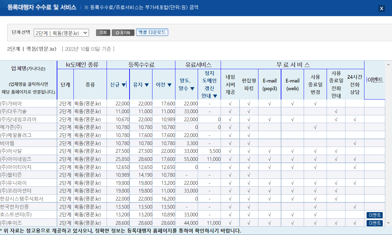 국내 도메인 등록 대행 업체별 수수료 및 부가서비스
