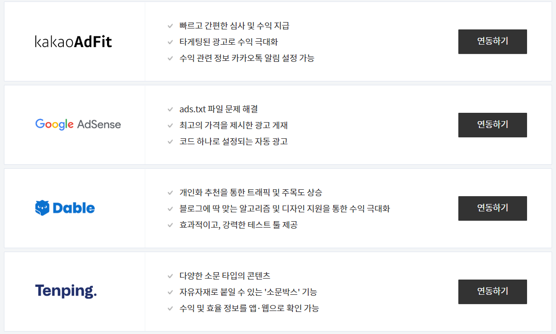 - 애드센스 광고 수익 : 워드프레스 또는 티스토리를 이용해서 블로그를 개설한 후에 광고를 삽입해서 수익을 만들 수 있다. 이러한 광고를 제공하는 곳은 카카오 애드핏, 구글 애드센스, 데이블, 텐핑 등 다양하지만 안정성과 편의성 그리고 광고 단가를 고려하면 애드센스를 메인으로 추천한다.