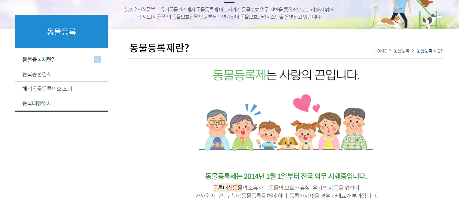 반려동물의 보호와 유실 및 유기 방지를 위해서 동물보호법 개정을 통해 2014년 1월부터 반려견의 등록을 의무화한 제도다. 반려인들은 입양, 사망, 변경 등의 사유가 발생하는 경우 등록 대행업체 또는 전국 시청, 군청, 구청에 관련 내용을 신고해야 한다.