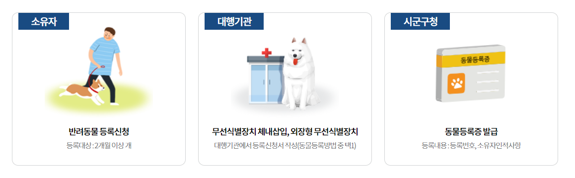동물등록은 시·군·구청 또는 등록 업무를 위탁받은 동물병원, 동물 보호를 목적으로 하는 비영리 단체, 시·군·구청에서 설립한 동물보호센터, 등록된 반려동물 판매업자를 통해서 가능하다.