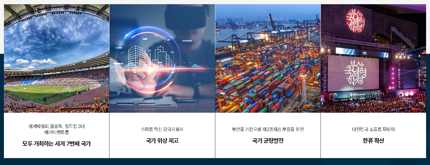 • 올림픽, 월드컵, 세계박람회 3대 메가 이벤트를 모두 개최하는 세계 7번째 국가로 대한민국의 국격 상승