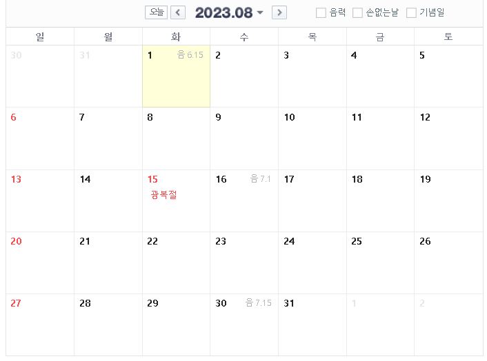 무더위가 기승을 부리는 8월에는 우리 민족이 일본이게 빼앗겼던 나라의 주권을 다시 찾은 광복절이 공휴일로 지정되어 있다. 광복절을 전후로 무더위도 한풀 꺾이게 된다.