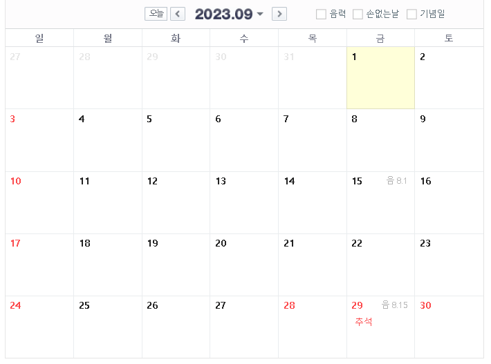 | 9월 28일 ~ 30일 | 추석 | 목 ~ 토 |