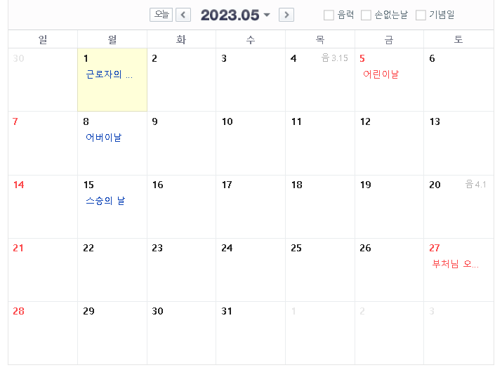매년 5월은 가족의 달로 많은 기념일이 있다. 근로자들에게는 법정 공휴일로 지정된 근로자의 날이 1일 월요일이고, 어린이날이 5일 금요일, 부처님 오신 날이 27일 토요일이다. 석가탄신일(부처님 오신 날)은 27일에는 올해부터 대체공휴일이 적용되면서 29일 월요일이 휴무일이 된다. 공휴일은 아니지만 효를 중요시하는 우리나라에서 꼭 챙겨야 하는 하는 8일 어버이날과 스승의 날 15일도 기억해야 한다.