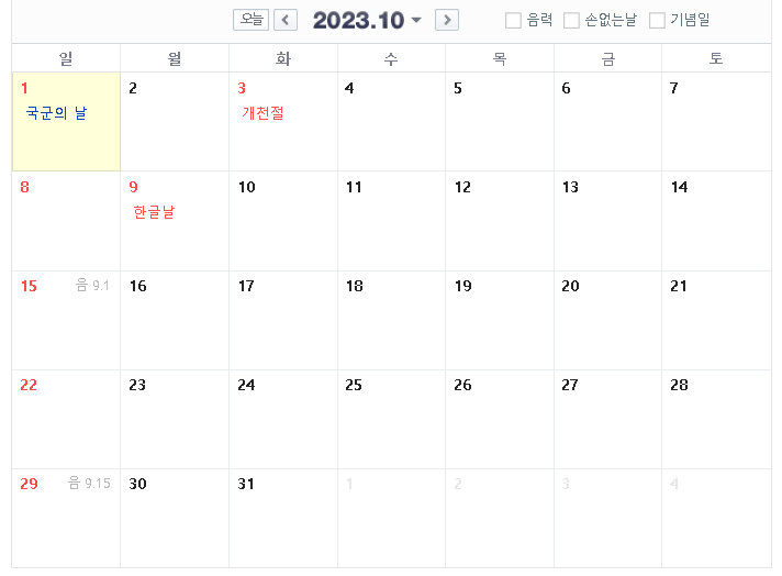 10월 3일은 단군이 우리나라의 최초 국가인 단군조선을 건국한 날을 기념하는 날로 "하늘을 여는 날"이라는 의미로 개천절(開天節)이라고 한다. 2일 날 휴가를 사용하면 추석부터 6일간의 황금 휴일이 생기게 된다. 세종대왕이 장제한 한글의 독창성과 우수성을 기념하는 9일 한글날도 잊지 말아야 한다. 안타까운 이태원 참사가 발생한 핼러윈은 10월의 마지막 날이다.