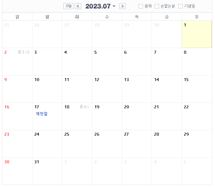 장마가 끝나고 무더위가 시작되는 달이므로 건강 관리에 신경을 써야 한다. 7월에는 공휴일은 없으나 대한민국의 헌법을 제정하고 공포한 것을 기념하기 위해 국경일로 지정된 제헌절이 있다.