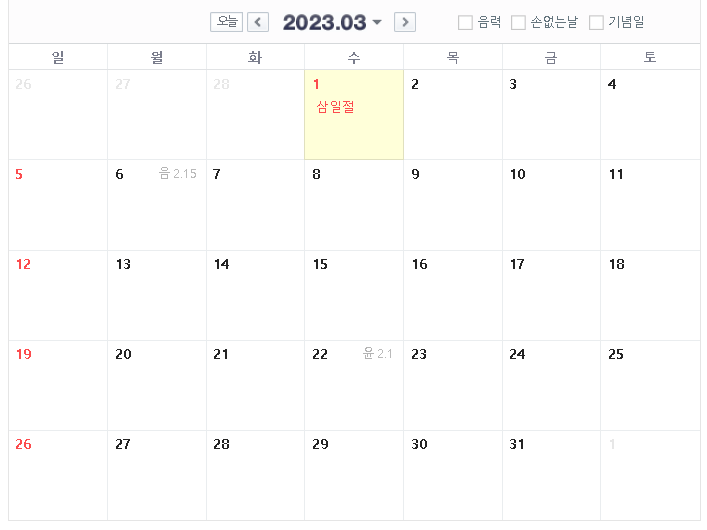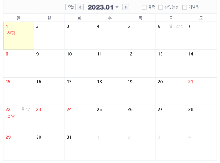1월 1일 신정과 우리나라의 가장 큰 명절인 설날이 일요일이라서 평년에 비해 휴일이 짧다. 설날은 대체공휴일을 포함해서 4일간 쉴 수 있다.
