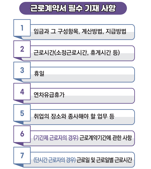 고용노동부에서 제공한 표준 근로계약서 7종(기간제근로자, 미성년근로자, 건설일용근로자, 단기간근로자, 외국인근로자 등)의 서식을 살펴보면 이해가 쉬울 것이다.