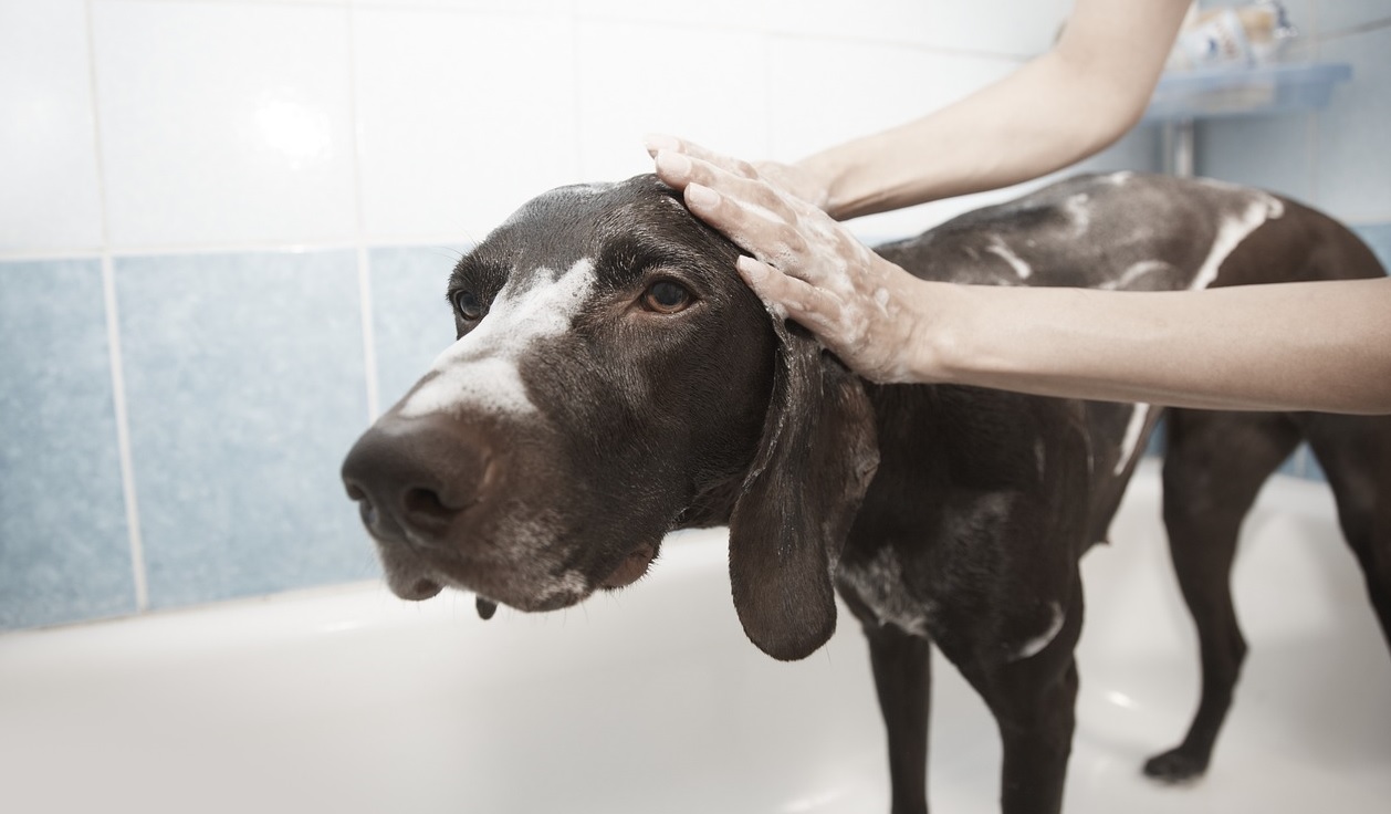 강아지의 털에 소량의 샴푸 바르고 목부터 꼬리까지 부드럽게 마사지를 하면서 거품을 낸다. 몸 전체에 거품이 충분히 났다면 이제 샴푸가 몸에 남아있지 않도록 충분하게 헹궈야 하는데, 얼굴과 귀에 물이 닿지 않도록 주의해야 한다.