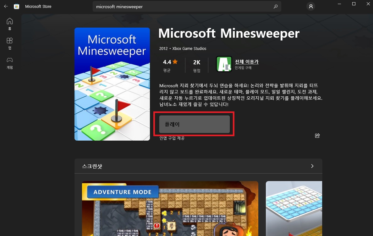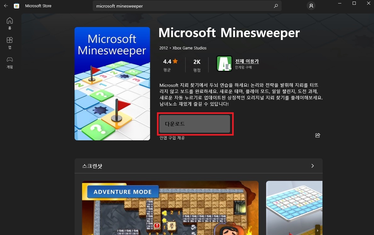 ③ "Microsoft Minesweeper" 앱을 클릭한 다음 "다운로드 버튼"을 클릭해서 설치한다.