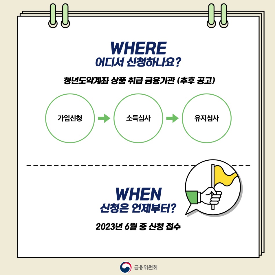 신청방법에 대한 자세한 내용은 6월 중에 발표된 예정으로 청년도약계좌 상품을 취급에는 금융기관을 통해서 가입신청을 하면, 나이와 개인소득 및 가족 소득 등에 대한 심사가 진행된다. 가족 소득에 대한 심사는 최초 1회에 한 해 진행하며, 개인 소득에 대한 심사는 1년마다 재심사가 진행된다.