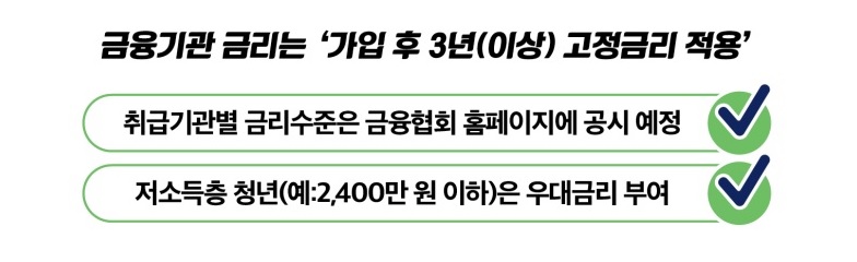 청년도약계좌를 운영하는 금융기관의 금리는 금융 협회 홈페이지를 통해서 사전에 공지될 예정으로 5년의 기간 동안 고정 금리 3년과 변동 금리 2년으로 운영되고, 연 소득 2,400만 원 이하의 저소득 청년에게는 우대금리가 부여될 예정이다.