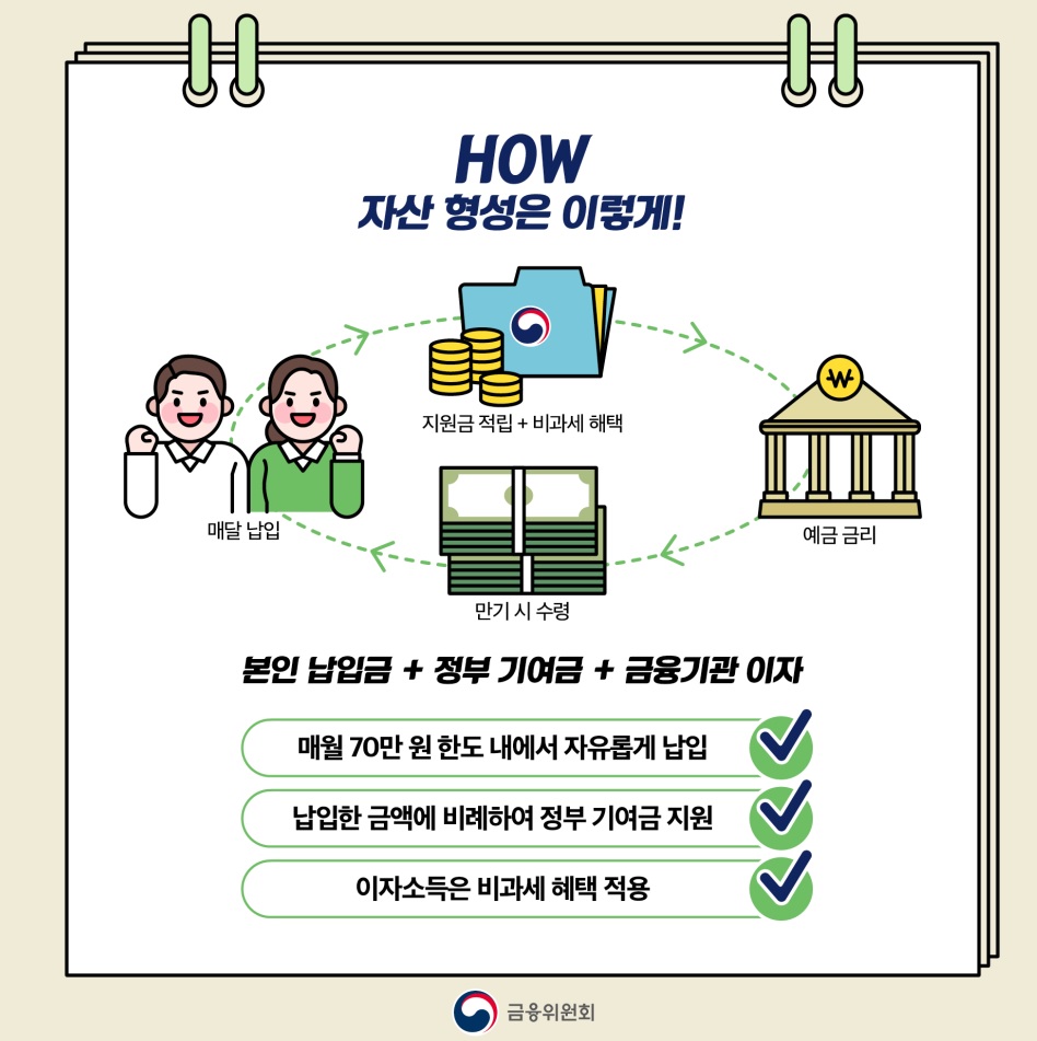 정부 기여금의 규모는 월 납입액 40~70만 원에 대해 기여금 매칭비율은 최대 6%를 기준으로 적용되는 데, 이는 가입자의 소득이 낮을수록 더 많은 지원이 이뤄지도록 하기 위한 것이다. 예를 들면 총급여가 2,400만 원 이하인 사람이 매월 40만 원을 납입하면 정부 기여금 매칭비율의 최대인 6%를 적용받아서 매월 2만 4천 원을 지원받게 된다. 또 총급여가 6,000~7,500만 원 이하인 사람은 정부 기여금에 대한 지원은 받지 못하고 이자 소득에 대한 비과세 혜택만 받게 된다.