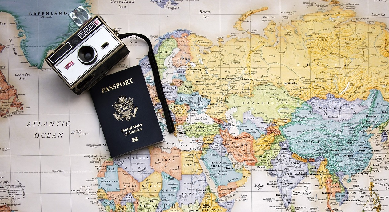사진 = 여행에 필요한 용품(지도, 여권, 카메라)