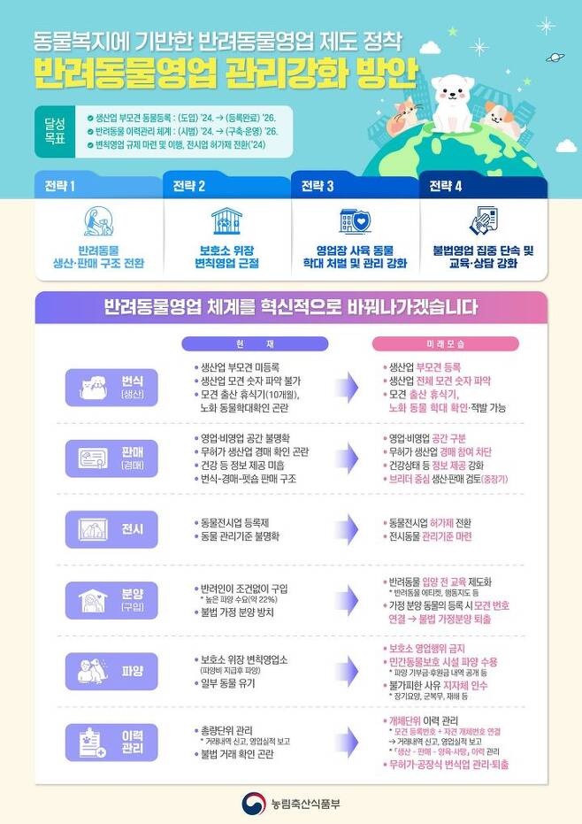 정부가 반려동물 사업 강화를 위해 무분별한 번식과 유통, 영업장 변칙 및 불법 영업 행위 등을 막기 위해 '반려동물 영업 관리 강화 방안'을 발표했다.